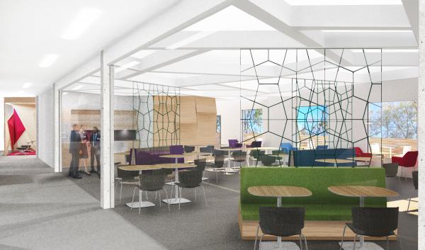 C’est un lieu ergonomique qui favorise le partage des connaissances par la planification des bureaux selon les liens formés par les équipes de travail. L’environnement permet à l’employé d’effectuer son travail à divers endroits entre le bureau formel, les espaces de collaboration, les salles de réunion et les zones caucus, en interagissant de diverses façons avec ses collègues.