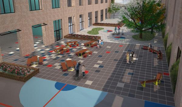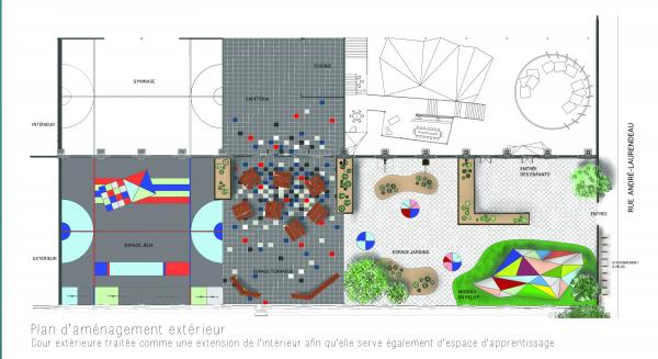 Le design se traduit par des plans dégagés, divisés en plusieurs zones, où le professeur est à même de se déplacer sans être confiné à sa traditionnelle salle de classe pour enseigner. Les espaces se veulent ludiques et colorés, sans pour autant être trop stimulants.