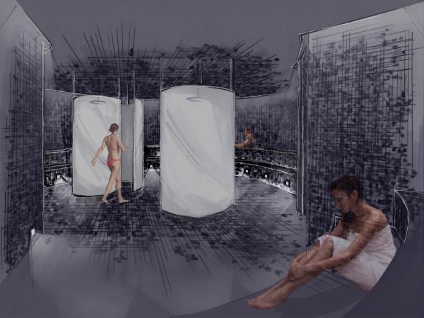 telles une inspiration des anciens thermes romains. L’eau se présente sous différentes formes tout au long du parcours. À la fois sculpture dans l’espace et sculptrice de celui-ci, elle guide l’usager à travers les différentes salles. Le bassin d’eau salé, élément phare du projet, visible dès l’entrée du spa, conduit le visiteur jusqu’à la réception cintrée d’eau.