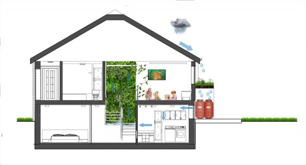 C’est au centre de l’habitation, évoluant au rythme des saisons et sous le regard de tous, qu’un mur végétalisé prend vie. Il intègre des plantes aux pouvoirs dépolluants. L’installation d’un toit vert et d’un système de récupération d’eau de pluie ainsi que l’utilisation de matériaux sains réduisent l’empreinte environnementale. L’avant-plan mis sur le contenu des installations permettra aux usagers de remettre en question leur consommation des ressources naturelles.
