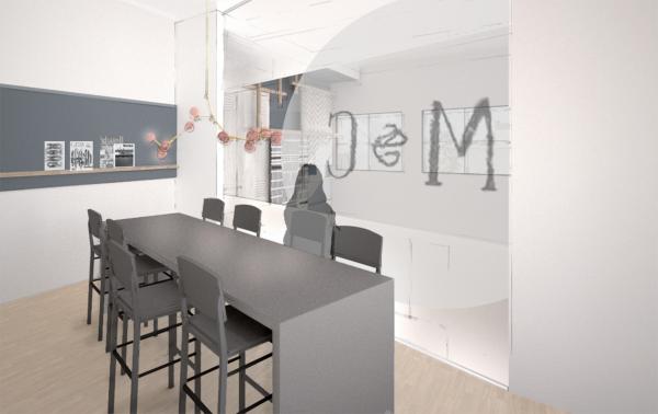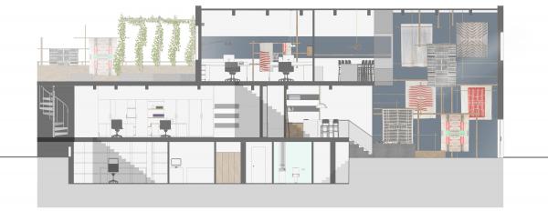 Dès l’entrée, le client entrevoit les artisans à l’œuvre dans l’espace de fabrication éveillant sa sensibilité à l’unicité des couvertures artisanales. À l’étage, création et tâches administratives y sont accomplies. Le sous-sol est dédié à l’emballage et à l’expédition.
