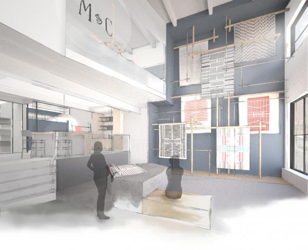 Par souci de cohésion avec la démarche artistique de Meg Callahan, la composition linéaire et géométrique de l’aménagement intérieur met en valeur l’assemblage et la souplesse des textiles.