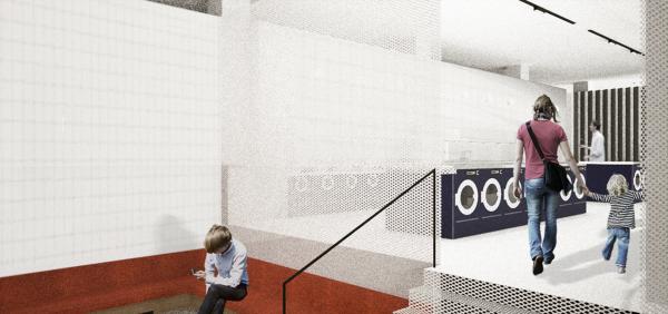 Dans l’optique de réinterpréter une activité de routine solitaire dans un contexte public, l’espace buanderie s’impose au lieu de façon centrale, dans une forme abstraite et sur un second niveau. Elle suggère un parcours sur deux axes qui favorise la fonctionnalité et les rencontres entre usagers.
