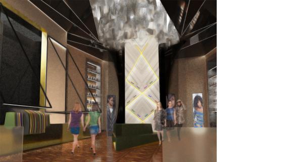 Sur deux niveaux, l’entrée se fait à partir d’une agora créée à l’aide de la façade existante du bâtiment. Au premier niveau se trouve les parfums et l’accueil des clients. À l’arrière de cette zone se trouve un salon privé pour essayage ou pour présentation. Un double escalier nous mène au deuxième étage où s'alignent le long des murs la collection homme d’un côté et la collection femme du côté opposé. Tout au fond se situe l’élément clé d’une boutique : les cabines d’essayage. Sur plus de 24 pieds de haut se tiennent de sculpturales cabines d’essayage qui reprennent la formule du boudoir pour l’intimité de l'usager.**