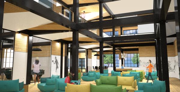 L’aménagement se répartit sur deux étages avec une ouverture sur l’ensemble du centre récréatif grâce à une mezzanine centrale. Cette grande visibilité sur l’espace permet aux jeunes de se l’approprier et d'en faire un refuge où s’éclipser et décrocher de leur vie routinière.