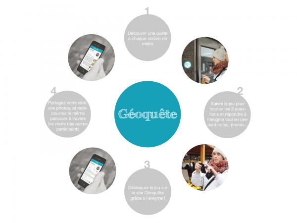 Depuis plusieurs années, la marche urbaine n’est plus seulement perçue en termes de performance et de vitesse, mais devient un moment à créer, un temps pour soi. Nous marchons tous les jours, mais connaissons-nous vraiment notre quartier ? Pourrions-nous mieux profiter de la marche pour redécouvrir notre ville ? Géoquête est un jeu urbain à deux niveaux, réel et virtuel, enrichissant l’expérience quotidienne des Montréalais et valorisant le territoire de façon ludique et dynamique. Des parcours à énigmes démarrant aux stations de métro permettent de découvrir différents quartiers de Montréal et mettent en avant l’aspect narratif de la marche. Une fois l’énigme résolue, le jeu en ligne se débloque et les participants peuvent raconter leur promenade et accéder aux récits des autres. Le jeu s’enrichit à travers les multiples récits et incite les usagers à refaire un même parcours, avec d’autres participants ou seul, à travers le récit surprenant d’un autre.
