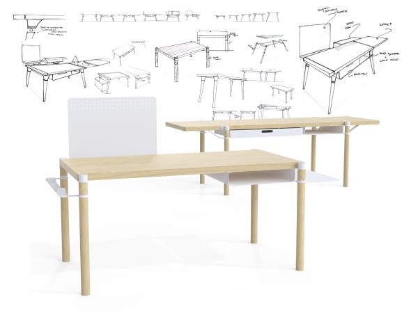 Le travail à la maison est une tendance manifeste. Ce type de travail génère de nouveaux besoins auxquels les postes de travail traditionnels ne répondent pas adéquatement. Pour les travailleurs indépendants créatifs, ce problème est encore plus présent, puisque leurs besoins évoluent avec le temps et changent d’un projet à l’autre. C’est pourquoi le poste de travail prend la forme d’une table modulaire offrant une multitude de points d’ancrage, dont une bague située au niveau des piétements qui peut accueillir différents éléments répondant chacun à un besoin spécifique. S’ajoutant à une configuration personnalisée selon les préférences, le poste de travail évolue ainsi avec les besoins changeants de son propriétaire et optimise l’investissement de départ grâce au matériau des modules. L’esthétique géométrique fonctionnaliste minimise les éléments à analyser visuellement, favorisant la concentration, l’objectivité et la discipline dans le travail de création. Cette esthétique est guidée par une philosophie de simplicité visant à s’intégrer dans tout type d’environnement.